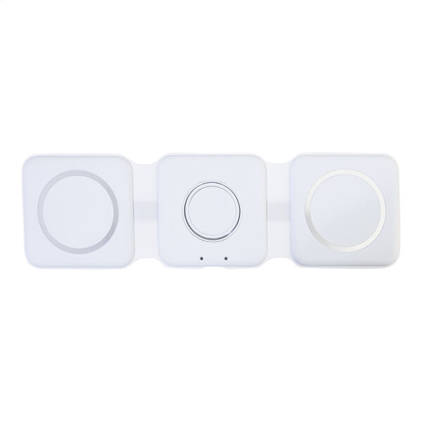 Opvouwbare mobiele telefoonhouder en draadloze opladerset in gerecycled ABS. Met magnetische draadloze snellader (15W), draadloze oplader (5W) voor oortelefoons en draadloze oplader (2,5W) voor slimme horloges (alleen Apple®). Inclusief zelfklevende metalen ring voor telefoons zonder magnetisch oppervlak. Inclusief USB lader kabel.