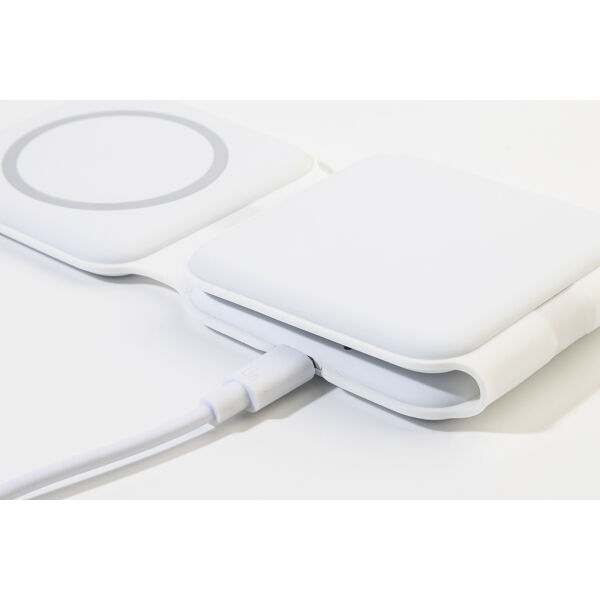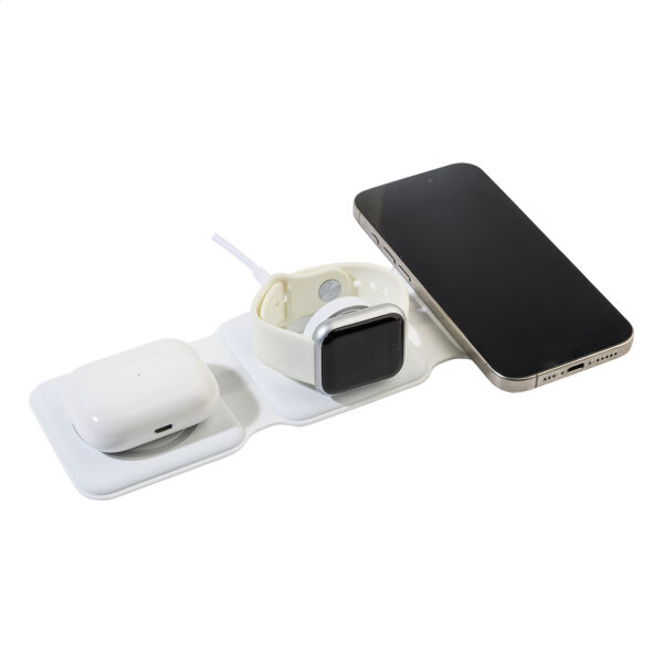 Opvouwbare mobiele telefoonhouder en draadloze opladerset in gerecycled ABS. Met magnetische draadloze snellader (15W), draadloze oplader (5W) voor oortelefoons en draadloze oplader (2,5W) voor slimme horloges (alleen Apple®). Inclusief zelfklevende metalen ring voor telefoons zonder magnetisch oppervlak. Inclusief USB lader... → Lees meer