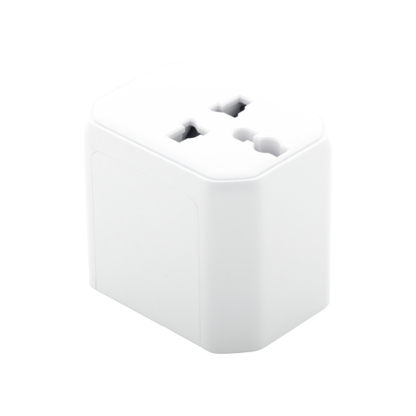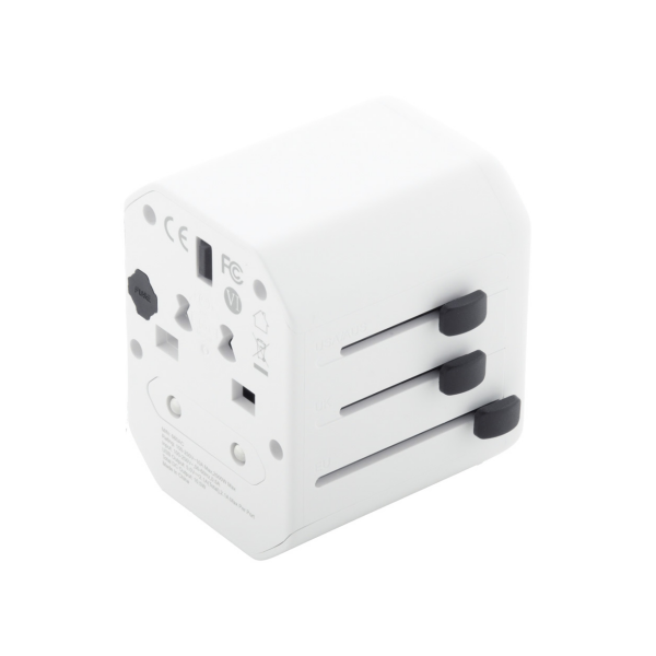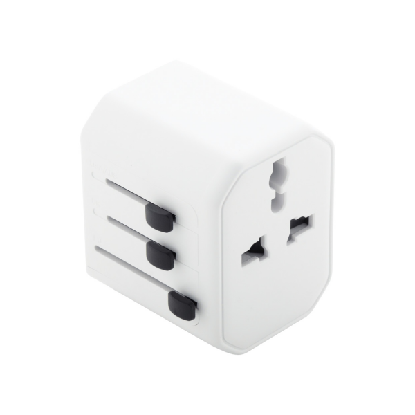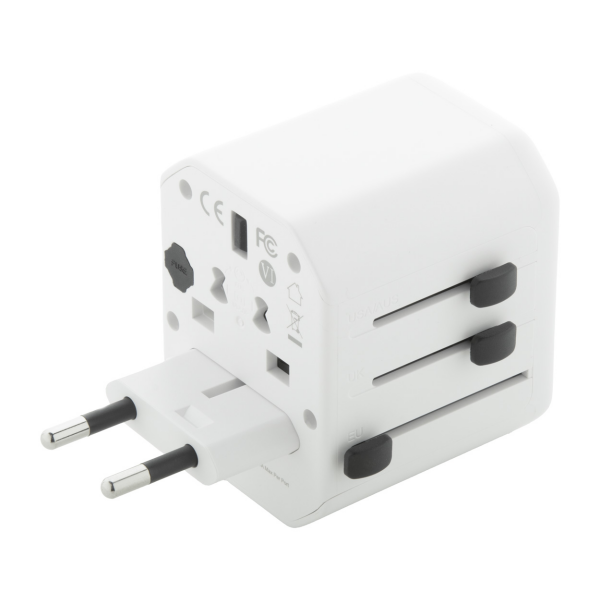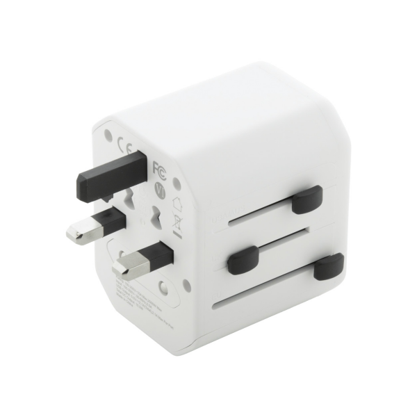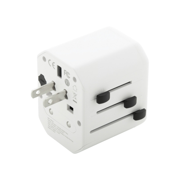 Universele wereldwijde reisadapter van ABS-kunststof, met ingebouwde stekkers voor de VS, Europa, Groot-Brittannië en Australië. Met 1 USB- en 1 USB-C-oplaadpoorten.