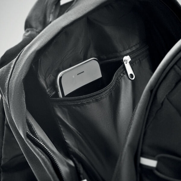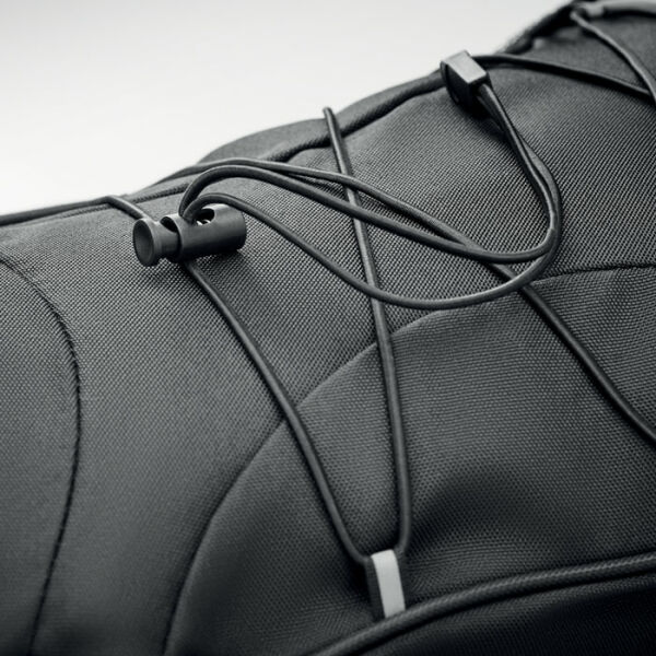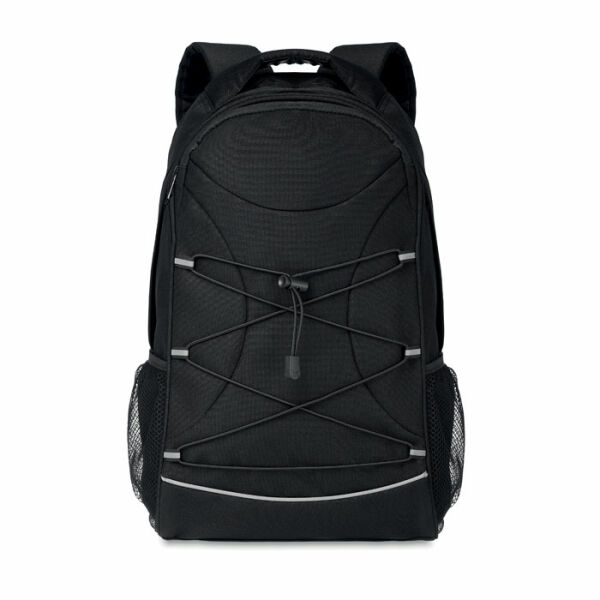 Rugzak gemaakt van 600D RPET met donkere bevestigingskoorden aan de voorkant en een reflecterend voorpaneel. Neem al je spullen mee in het ruime hoofdvak. Deze rugzak is een geweldige dagrugzak om alles wat je nodig hebt mee te nemen naar je werk of op reis. Gebruik het voorvak om kleinere spullen in op te bergen. Beide zijkanten van de rugzak zijn voorzien van een gaasvak waar je drinkflessen in kunt opbergen. Je kan de draagriemen eenvoudig aanpassen zodat de tas altijd comfortabel gedragen kan worden.Rugzak van 600D RPET met donker koord voor op de rugzak en een reflecterend paneel voor betere zichtbaarheid in het donker. Mesh zakken aan beide zijden van de rugzak.