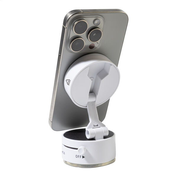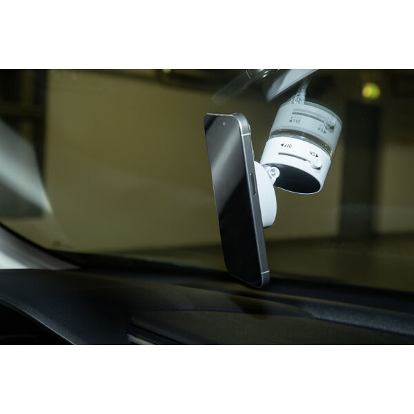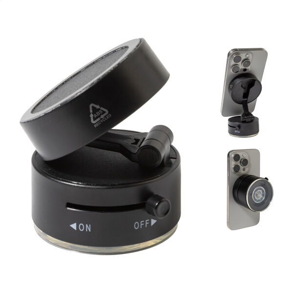 Gerecycleerde ABS magnetische auto mobiele houder met vacuüm zuig armatuur. Inclusief zelfklevende metalen ring voor telefoons zonder magnetisch oppervlak.