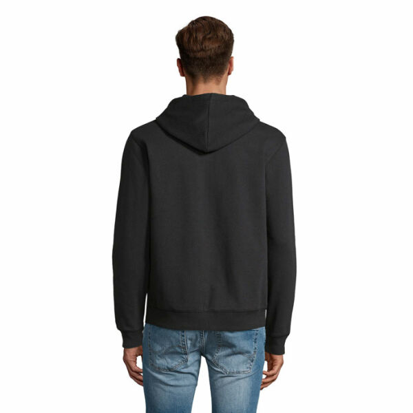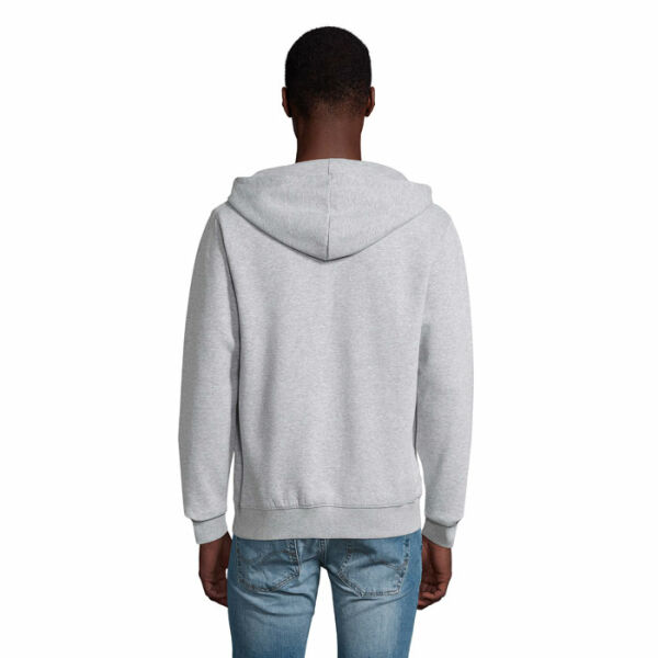 SOL'S SPIKE HEREN. Hoodie met rits voor heren, 80% ringgesponnen katoen - 20% polyester geborstelde voering. Buitenkant: 100% katoen FLEECE 280 LSF (Low Shrinkage Fabric), ingezette mouwen, 2 buidelzakken voor, gesneden en gestikt, gevoerde capuchon met ton-sur-ton trekkoord, 2x2 geribde manchetten en zoom. Halve maan binnenkraag, getapete nek, YKK ritssluiting. OEKO-TEX®. Uitsluitend verkocht met opdruk.