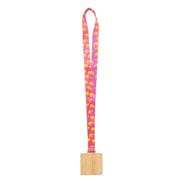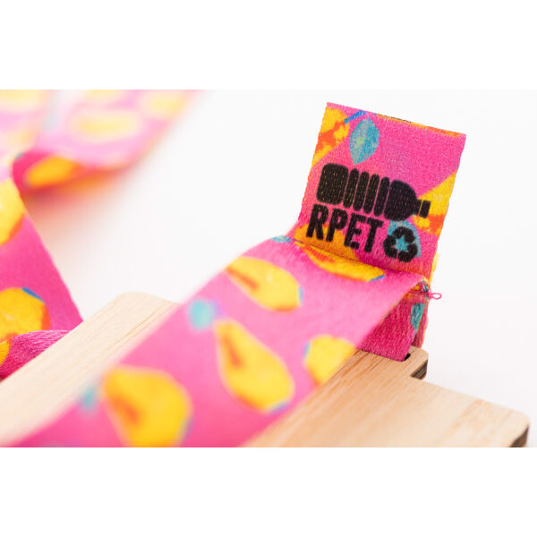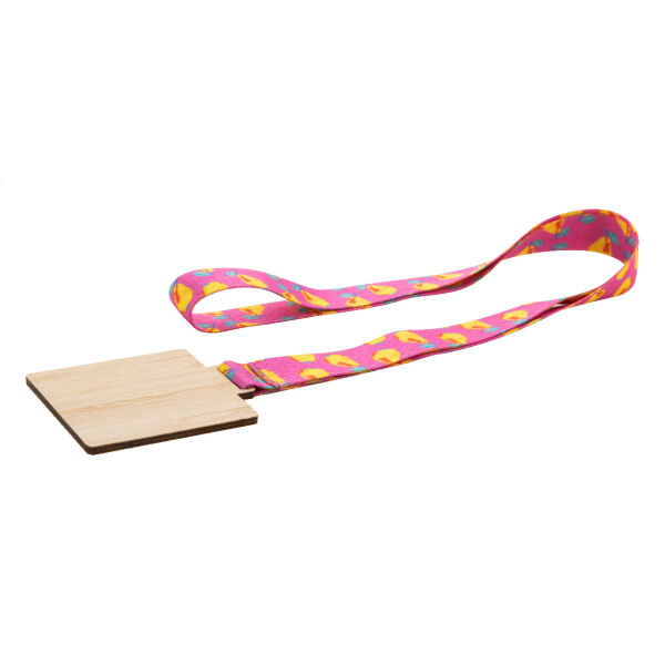 Custom made vierkant gevormde bamboe medaille op sublimatie bedrukte RPET-lanyard. Prijs is inclusief sublimatiedruk. MOQ: 100 stuks.