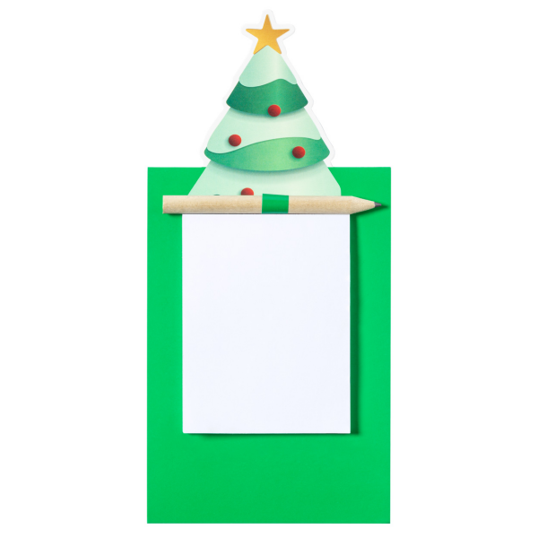 Magnetisch notitieblok met 40 blanco vellen en een kerstboomfiguur erop. Inclusief mini houten potlood.